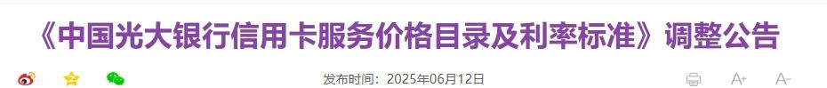 2025年6月12日光大银行发布《《中国光大银行信用卡服务价格目录及利率标准》调整公告》,宣布决定对《中国光大银行信用卡费率表》做出调整,主要调整内容如下: