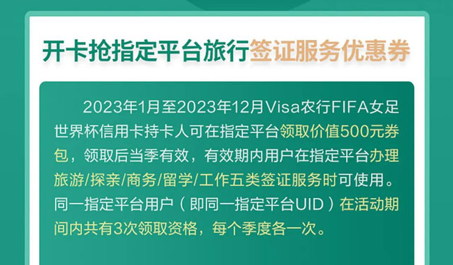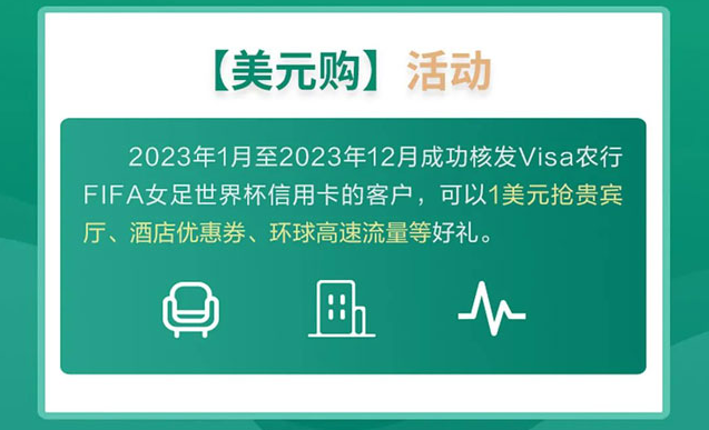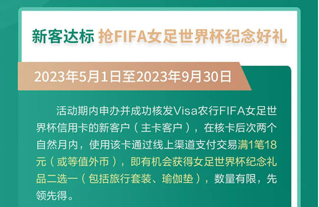 2023年5月11日农业银行信用卡中心推出Visa FIFA女足世界杯信用卡,主要特点如下: