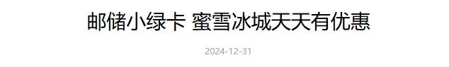 2024年12月31日邮储银行信用卡中心推出“邮储小绿卡 蜜雪冰城天天有优惠”活动,具体内容如下: