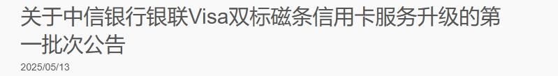 2025年5月13日中信银行发布《关于中信银行银联Visa双标磁条信用卡服务升级的第一批次公告》,宣布将于2025年6月28日(含)起,为以下银联Visa双标磁条信用卡的客户提供卡片芯片化升级服务。具体如下: